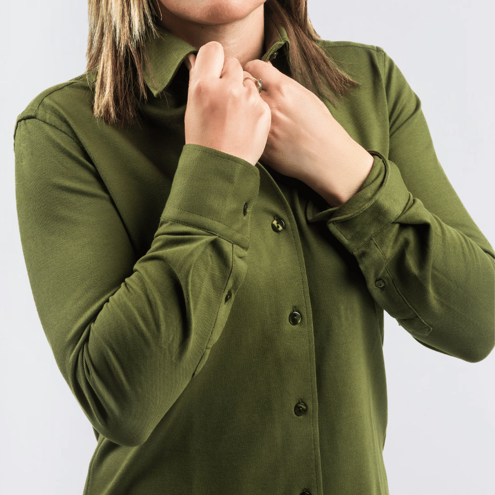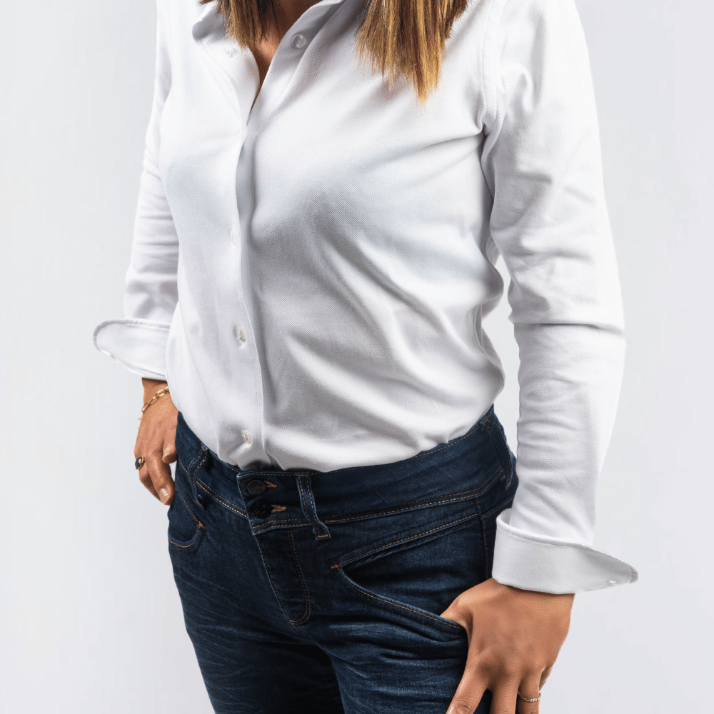 Le tissu en piqué de coton est assorti d’élasthanne, ce qui confère à la chemise une consistance souple et douce.