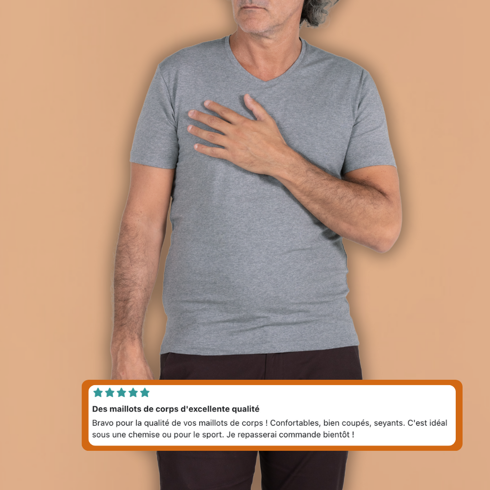 Bravo pour la qualité de vos maillots de corps ! Confortables, bien coupés, seyants. C'est idéal sous une chemise ou pour le sport. Je repasserai commande bientôt !
