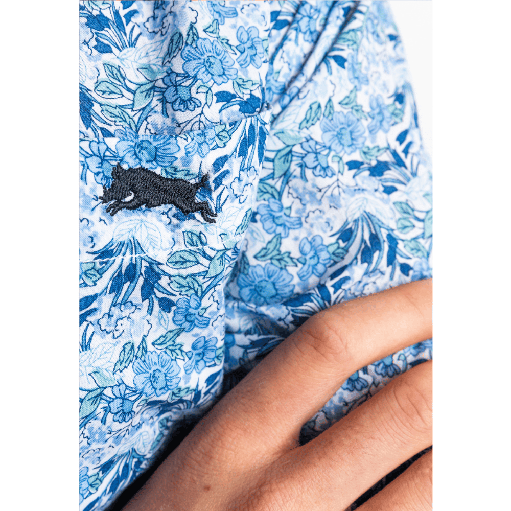 La chemise à manches longues et à petits motifs bleus s’inscrit dans le registre de l’élégance et du confort. La chemise a été confectionnée en France dans un tissu espagnol. Agrémentée de ses boutons en olivier gravés APER, elle a une coupe soignée adaptée à toutes les occasions.